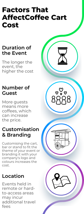 When planning to hire a coffee cart, it’s essential to consider several factors that will influence the overall cost. The price varies widely depending on the length of the event, the cart or bar selected, the number of attendees, and the level of customisation required.